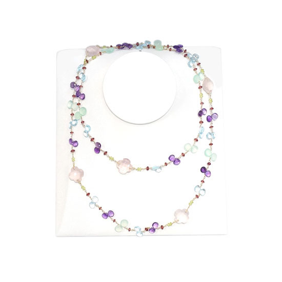 This is a gem necklace that comes in a colorful design. Using assorted gems, this necklace is elegant and graceful. This long necklace is suitable for wearing in a wrap around style to create a smart casual look.