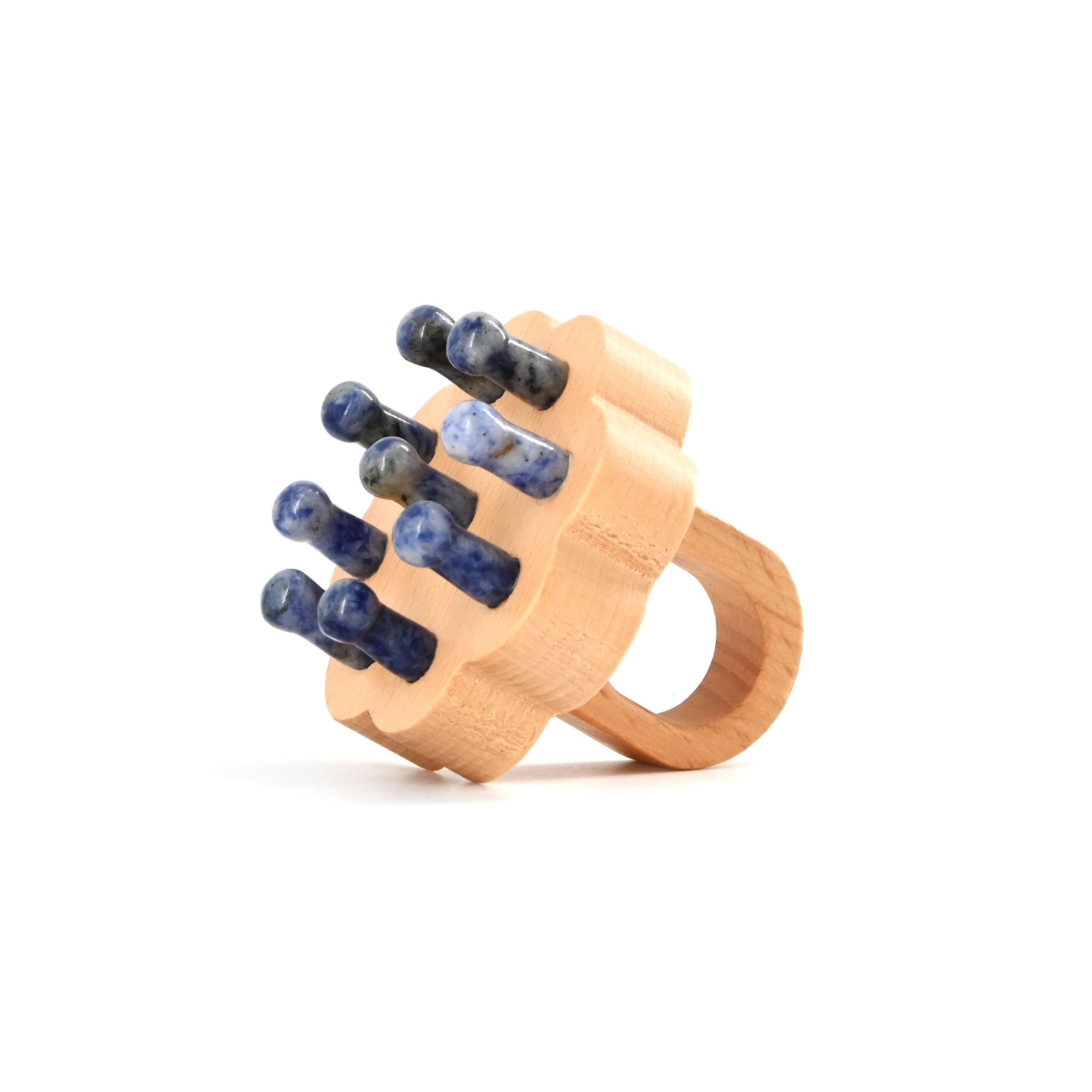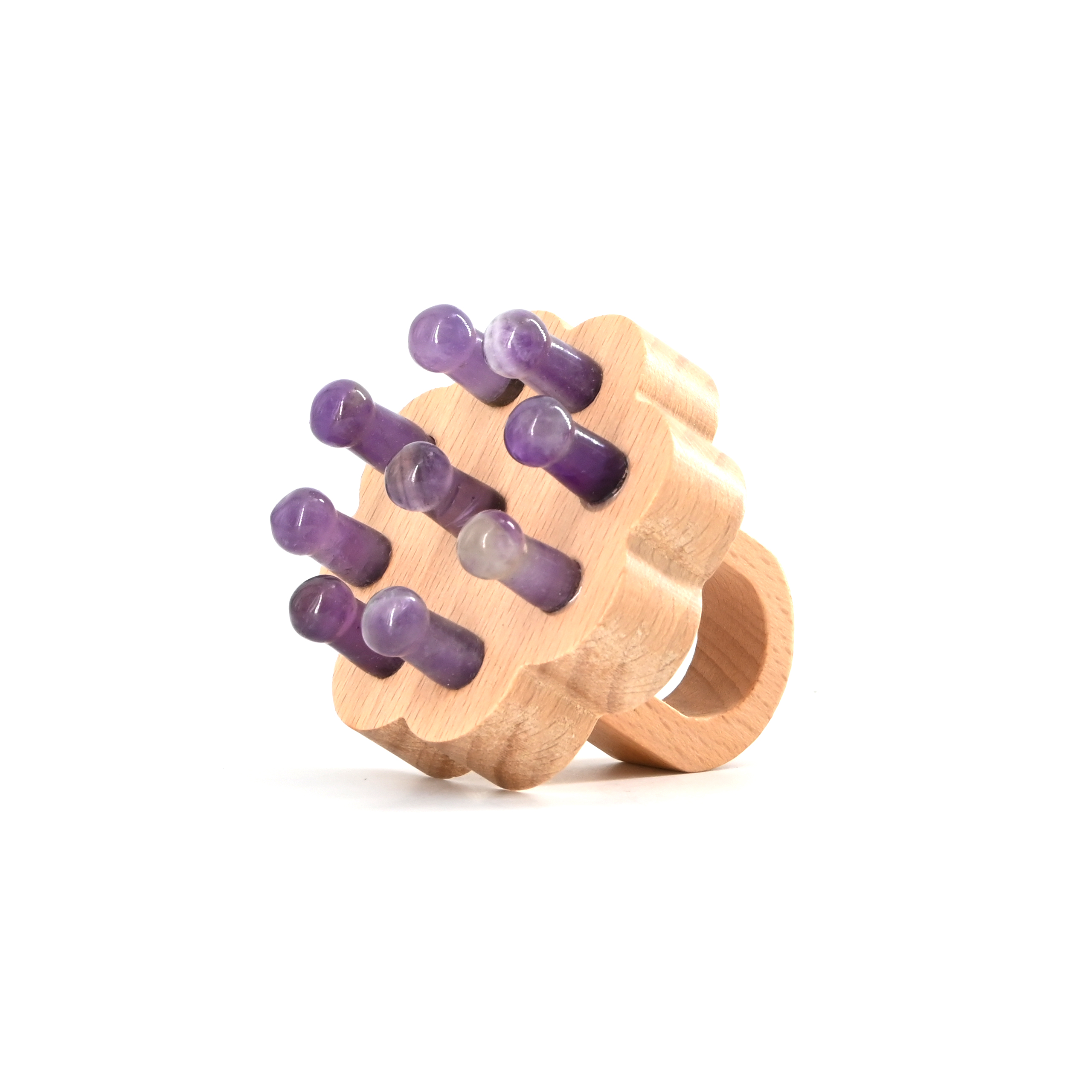 Ergonomic gemstone massage tool featuring healing stone heads and a floral-shaped wooden handle. Designed for scalp and body therapy.