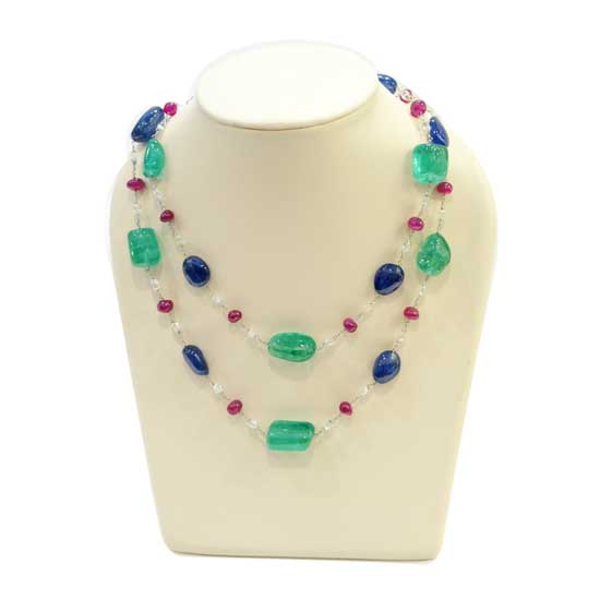 Highlighted here is a necklace adorned with rubies, sapphires, emeralds, diamonds, etc. The platinum casting ensures long-lasting beauty. This gemstone necklace is a great gift for your beloved one.