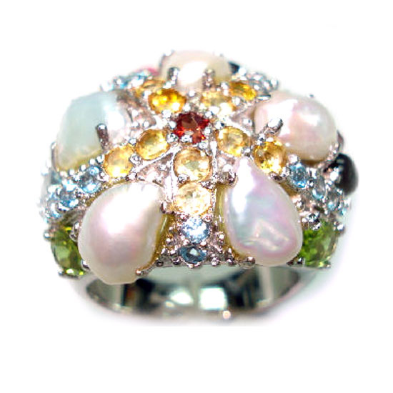 This stunning 925 silver ring is plated with rhodium. It is well arranged with peridot, citrine, blue topaz, garnet and tourmaline stones for a sophisticated look. This gemstone ring is ideal for matching a variety of outfits.