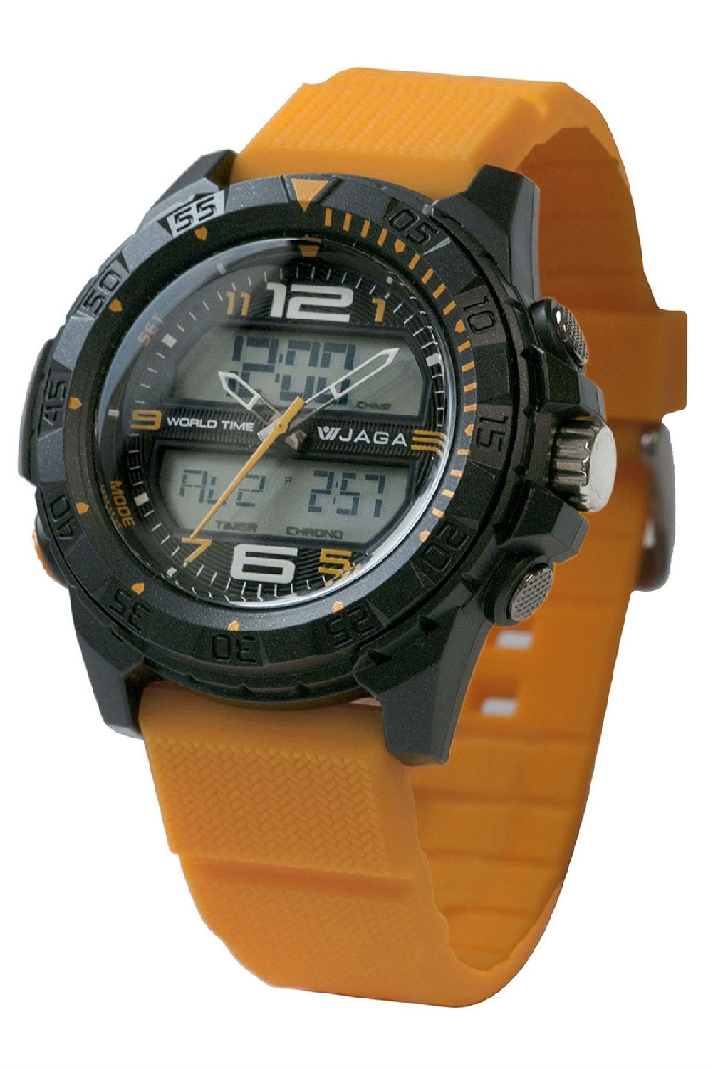 This sports watch has a plastic case in round shape and offers digital and analog time display. It has three hands with numeral hour indexes and provides versatile functions like alarm, chronograph and count down. The sports watch has an adjustable strap and is comfortable for every day wearing.