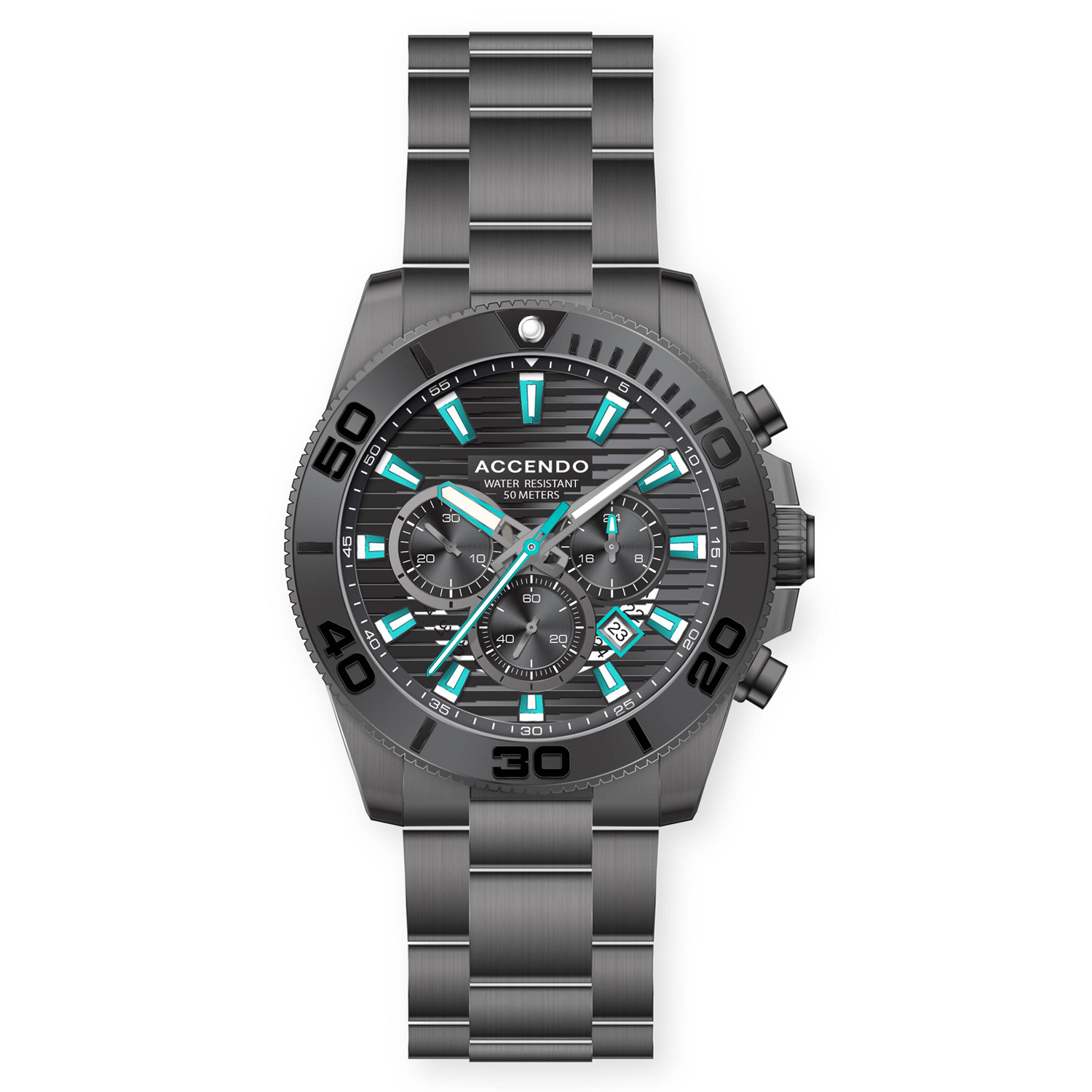 Stainless steel IP gun case, 5 ATM water-resistant, stainless steel IP gun band, gun dial with blue indexes and hands, Japan chronograph movement.