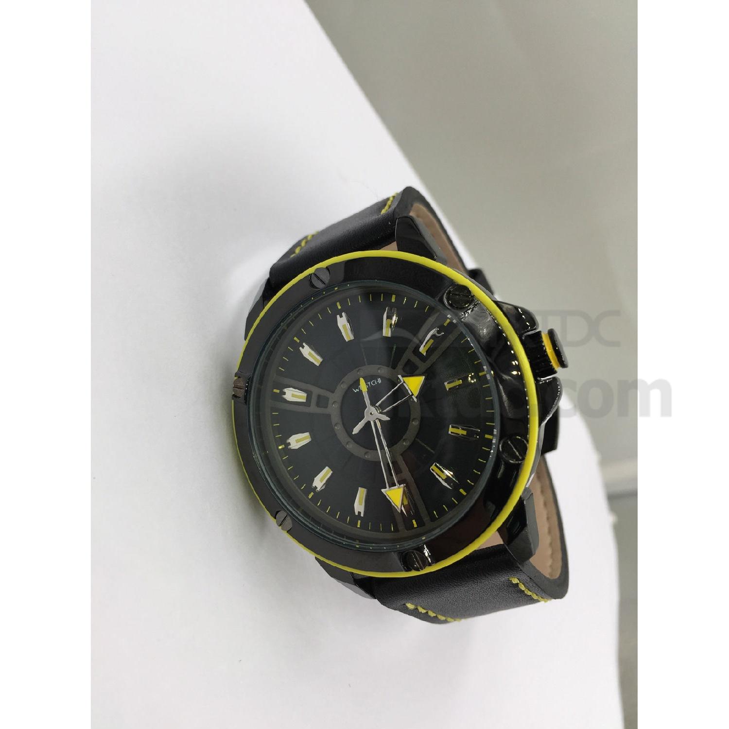 Gents sport watch 9139G: Alloy case with color silicon ring, color stitching on the genuine leather strap, citizen quartz movement , 3ATM water resistant,