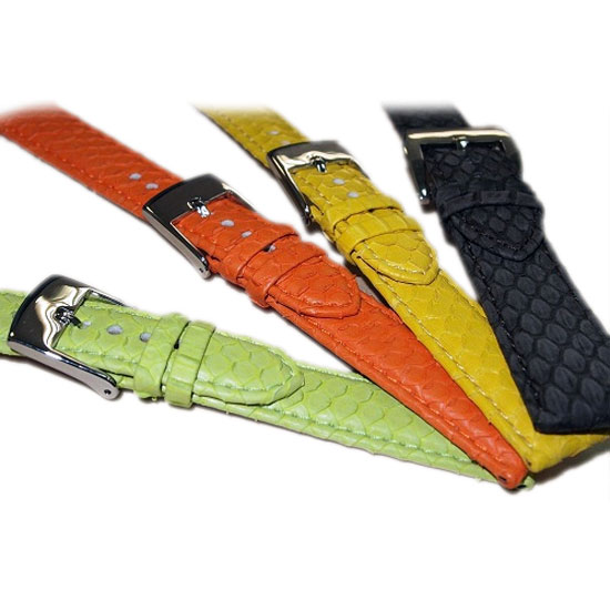 The strap adds elegance to your wrist with genuine water-snake leather construction. It features delicate scales with top stitching and a burnished buckle. The model is also available in a range of appealing colors.