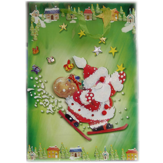 Shown here is a beautiful gift bag featuring a joyful Christmas theme. The bag comes with color prints of Santa Claus and little houses. Glittering and 3D finish is added for extra attraction.