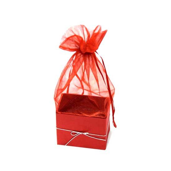 This gift box in bold red features a translucent pouch-like top with a drawstring. The bottom part is constructed from paper for durability. This joyful gift box makes a wonderful complement to your gift.