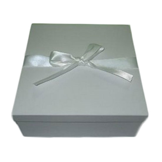 This is a gift box designed in a plain color. It is adorned with a matching ribbon bow for added elegance. This box is ideal for packaging assorted items.