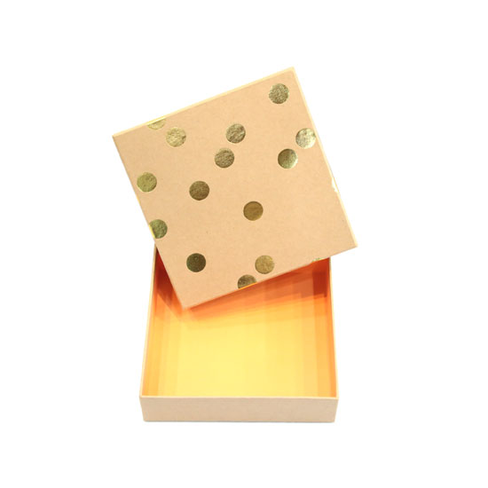 This is a classic gift box featuring a cuboid shape. The golden dots add some fun to the lid. It is essential packaging material for gifts and presents.