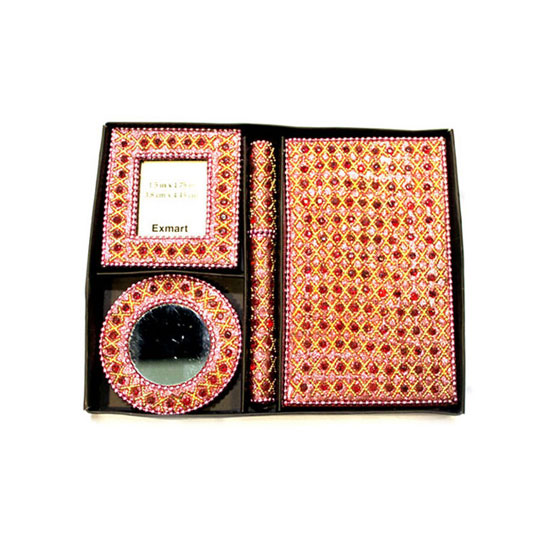 The picture displays an exclusive gift set including a photo frame, a mirror, a pen and a notebook. Unaccountable sparkling beads, stones are arranged into check patterns on these items for a glamorous appearance. It makes an exquisite gift for ladies.