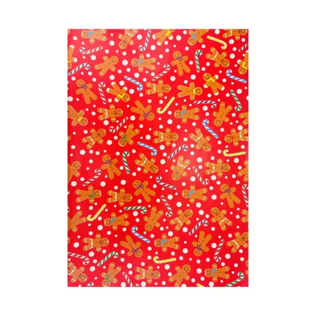 This wrapping paper uses a rich and warm bright red as the background color, creating a festive and cheerful atmosphere. The paper is densely covered with various gingerbread man patterns. These gingerbread men either smile charmingly, each of which is vivid. They are arranged in an orderly yet lively manner, adding endless childlike fun and a festive atmosphere to the wrapping paper.