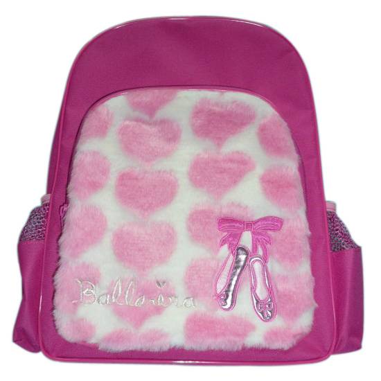This school bag is designed specially for girls. Being in pink, the favorite colour of many girls, this school bag must be loved by them. Its surface bears plush patterns in pink hearts, accompanied by a pair of ballet shoes and a ribbon. On both sides are mesh bags that can carry water bottles.