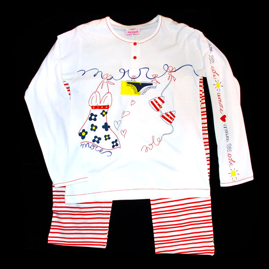 This lovely girls' pajama set features a colorful print and a round neckline. The red stripes on the bottom piece add an adorable touch to the pajama. The soft cotton fabric makes this stylish pajama set comfortable to wear.