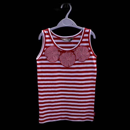 This round neck girls' striped tank top is decorated with three flower-shaped ornaments. The red and white design is casual and cheerful to look at. Made with high-quality cotton, this tank top keeps the wearer cool and comfortable.