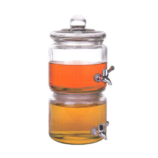 This 2-tier glass dispenser features a candy jar. The glass dispenser lets you serve tea, juice, beer, etc. in an elegant way. The glass dispenser is suitable for cafes, restaurants, bars, and more.
