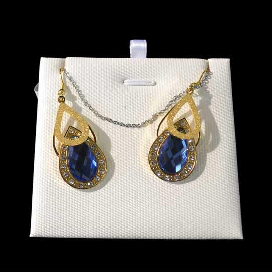 This pair of glass earrings features an elegant design. The deep blue stones are fitted in lustrous golden frames. The exquisite earrings go well with your daily outfit.