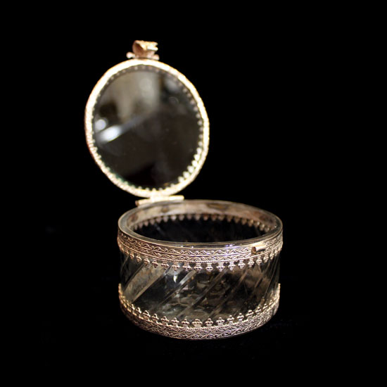 This antique-style jewelry box features a patterned transparent glass case with brass-decorated borders and closure. Unique, mysterious and flattering, this jewelry case is a luxurious gift for any lady. With exceptional craftsmanship, this jewelry box makes a collectible item in itself.