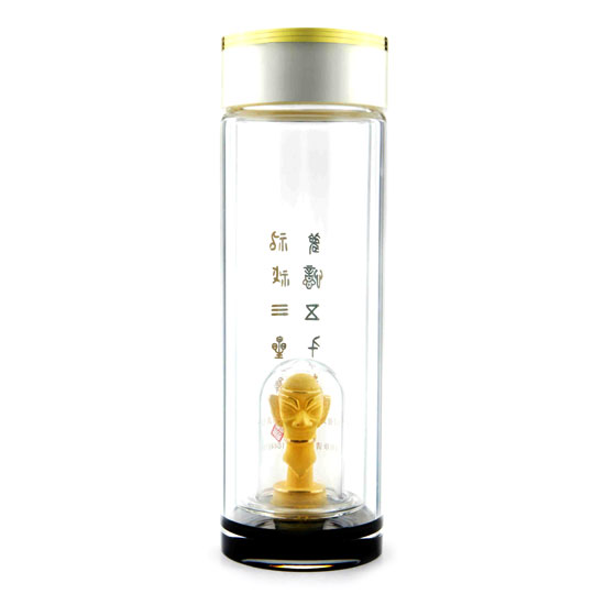 This is a glass mug decorated with Buddhist symbols. A nicely crafted sculpture shimmers at the bottom of the mug. When filled with water, the sculpture gently reflects the light, making the mug even more beautiful.