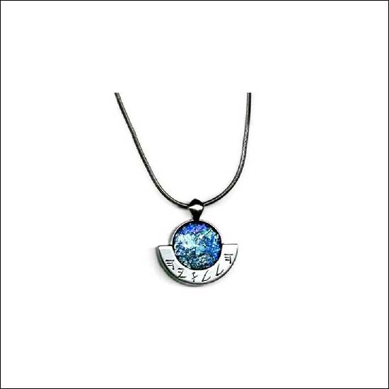 The pendant is a piece of bluish glass originated from a glass vessel discovered in Israel