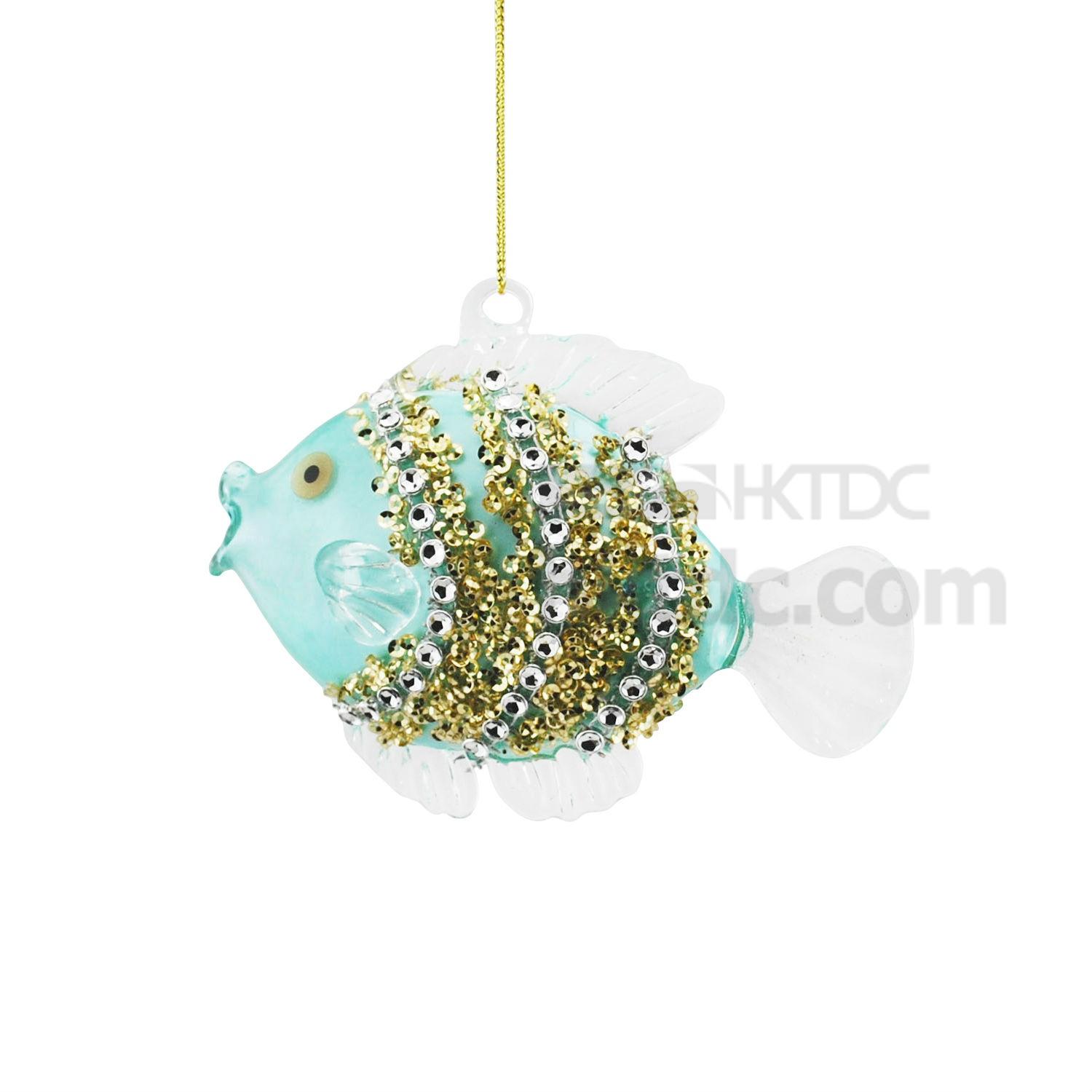 This blown glass ornament comes in a molded mercury fish themed design and is perfect for decoration use. It is decorated with beads and jewels then drizzled with glitter to give it spark. The glass fish has a gold toned string on top for hanging and is an excellent gift choice.