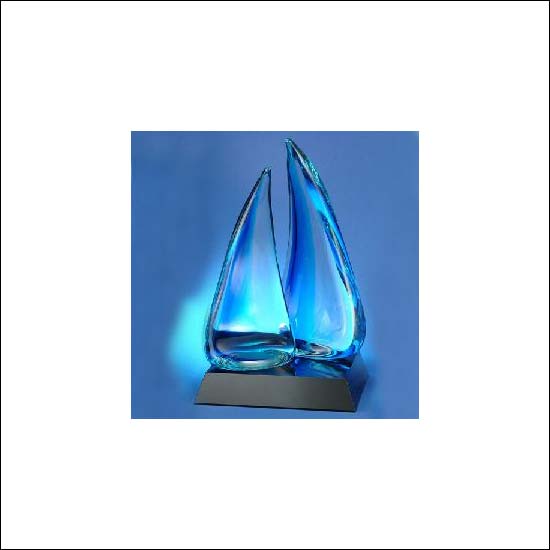 This is a hand made blue double sail on a black glass base