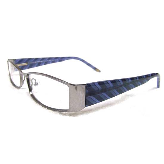 This pair of glasses has a metal front and plastic temples. The metal front gives the glasses an elegant appearance. The temples are very special in which is in bluish transparent with diagonal stripes as patterns. The patterns give variety to the glasses to make it more attractive. This pair of glasses is suitable for men, which gives them a professional look.