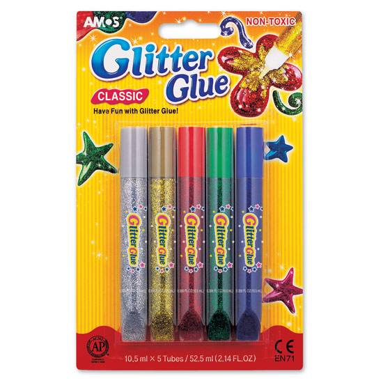 The glitter glue set is packed in a blister card. Five stick per pack with colours of silver, gold, red, green and blue. It is suitable for decoration.