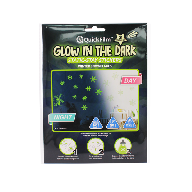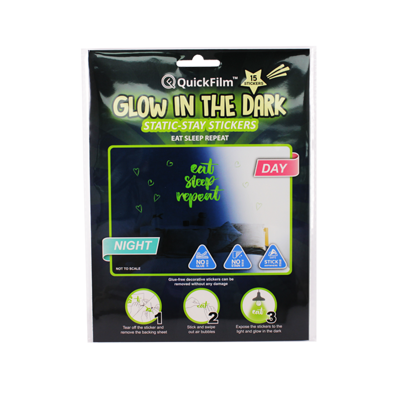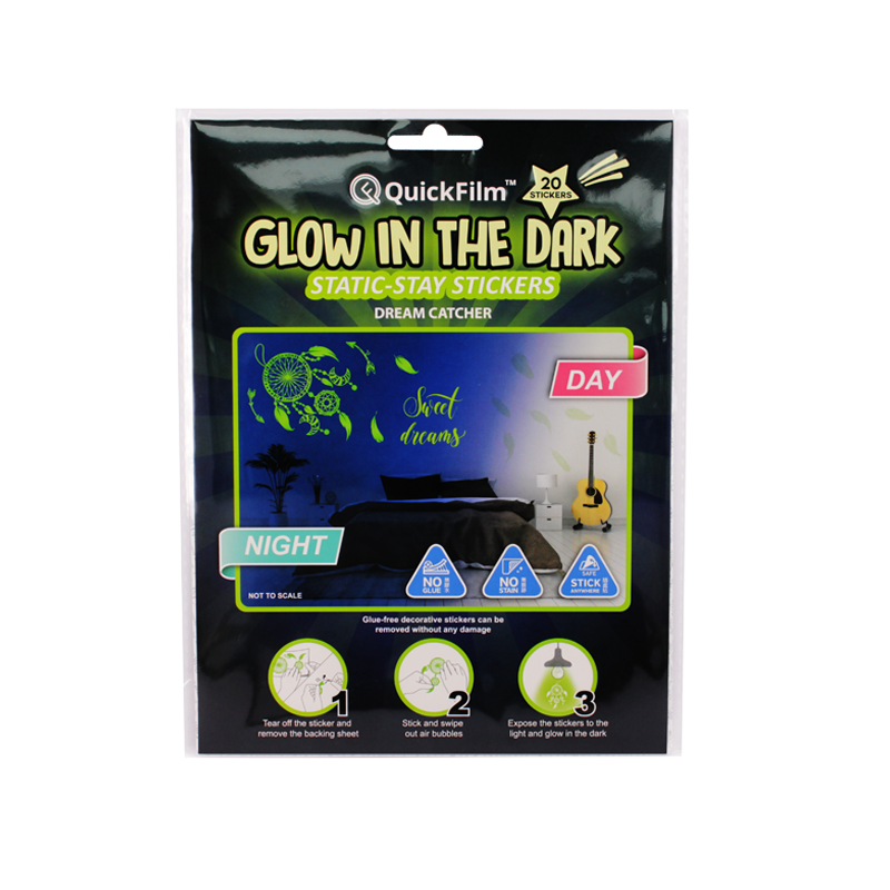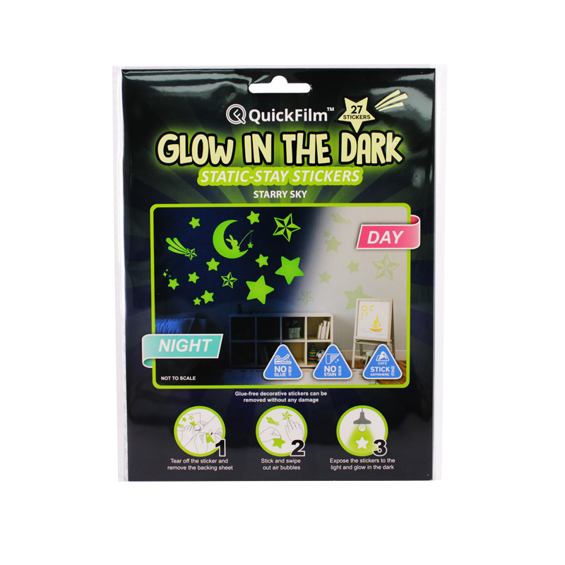 QuickFilm™ Glow-In-Dark Wall Decoration Stickers do not contain glue, can be moved easily, and leave no trace behind. It can be adhered to any smooth surface such as walls (including painted walls), ceilings, furniture, fridges, round surfaces, glass, etc. With one easy tear-and-paste motion, you can instantly renew the look of your interior, bringing constant freshness to your environment.