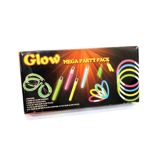 This is a box of glow stick set for party use. The playset comes with 8 pairs of glowing earrings, 8 pairs of glowing eyeglasses frames, 8 10cm slim glowing sticks, 16 glowing bracelets and 8 packs of 56cm glowing necklaces. This highlighted glowing stick set is fun to play with.