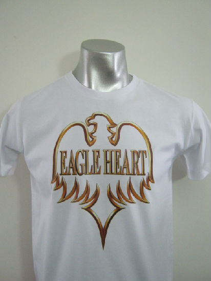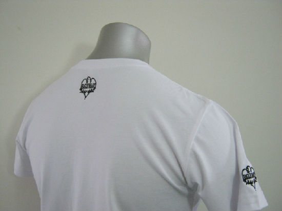 100% cotton round-neck white colour T-shirt, with gold metallic design on the front, and 2 black embroidered emblems