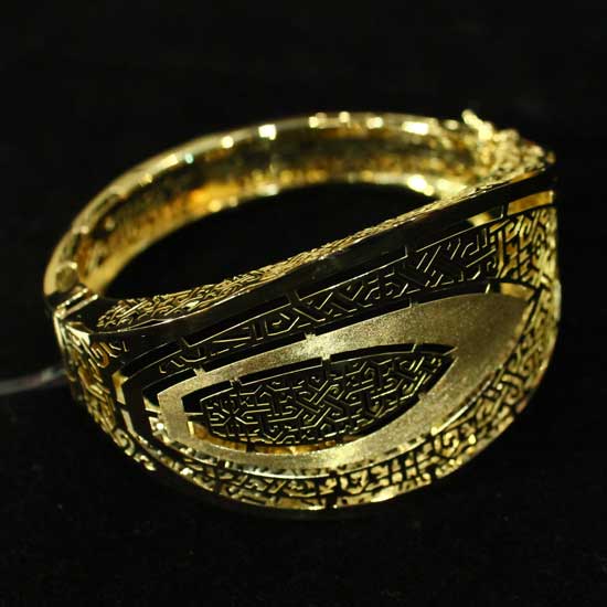 Outlined is a gorgeous gold bangle coming in a wide curvy shape. The glittering gold band is carved with delicate Celtic patterns with matt and shiny finishes. The elegant appearance makes it a desirable item for mix and match.