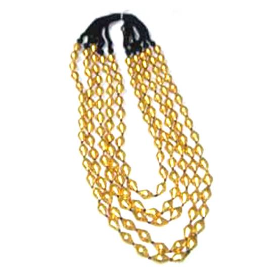 This is a bib necklace of 18 ct gold plated beads. The necklace with 5 strands has different length and the beads are linked with ropes. It has a good appearance which is a suitable accessory for women.
