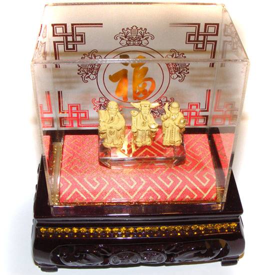 As shown is a gold decoration consisting of 3 figures representing good fortune, wealth and health. Made of 24K gold, this gold decoration is best for gift for the elderly.