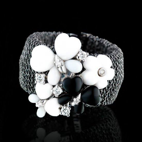 This finger ring comes with a fashionable and modern design. It is crafted with dazzling diamonds, agates and onyx stones for an elegant touch. This gold diamond ring is great for complementing your chic look.