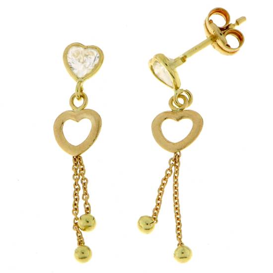 This pair of earrings looks young and creative. Both feature with two hearts, one small and one bigger. The smaller heart is filled with a heart shaped diamond-like stone. The bigger heart is an open work. Under the bigger heart, the two square link chains each of them hangs a piece of decoration that dangles and resembles bells.