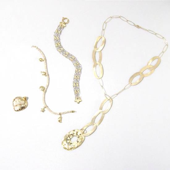 These are gold jewellery which includes a gold necklace with pendant, 2 gold bracelets and a gold pendant. The pedant is made into heart shaped where 1 bacelet is decorated with charms and the other is decorated with a torsade designs. The necklace is decorated with oval shaped chains.