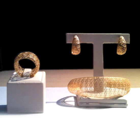 This gold jewelry set comprises a ring, earrings and a bangle in gold. The hollow design creates a see-through visual effect for added style. The pieces are all made with exquisite craftsmanship.