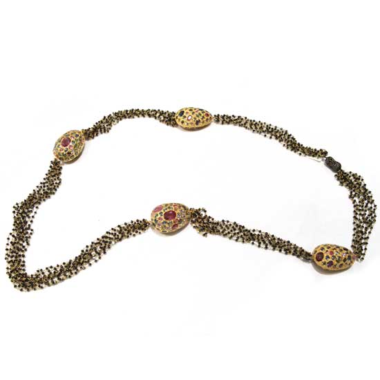 The showcased gold necklace is decorated with black diamonds and semi-precious stones. The yellow gold construction comes with multi-color stones. This gold necklace is a fashionable and chic accessory to pair with casual wear.