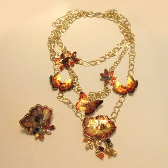 This is a set of 18K gold jewellery which includes a triple-strand necklace and a ring. The square link is embellished with gold and shiny flower and butterfly flat pieces on the front. Both the ring and the necklace feature a gaint flower with semi-precious stone danglings, creating a spring mood to the set.