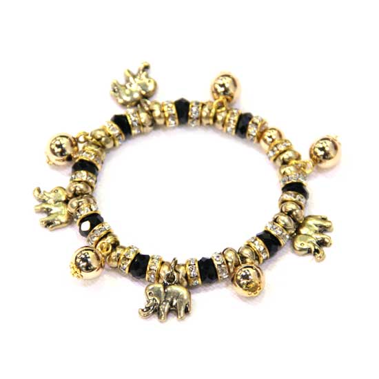 This eye-catching bracelet is adorned with elephant and ball-shaped charms in gold plating. The attractive bracelet is accented with stones for added sparkle. The trendy bracelet is a wonderful accessory for any ladies' jewelry collection.