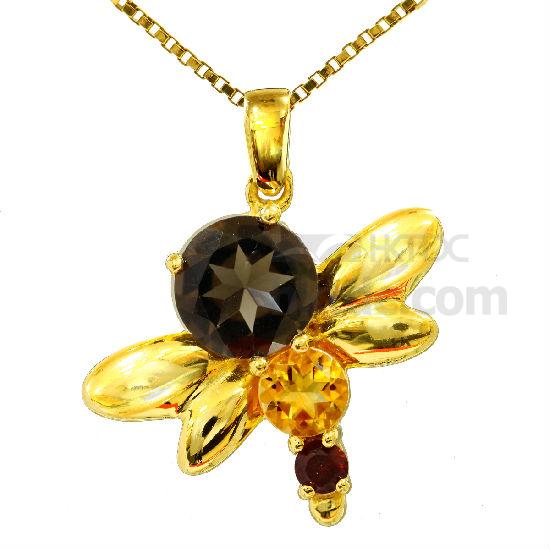 beautiful pendant best kept for the summer time. The pendant, fashioned out of 925 Sterling Silver sports a large Smoky Quartz at the top, a Citrine at the center and an Amethyst at the bottom. The design inspires fun and joy and will bring out the free spirit in you! Wear this pendant with a light sun dress and you are sure to become the center of everyone’s attention. The Silver here is plated with a layer of 18K Yellow Gold to give it an extra radiant shine.