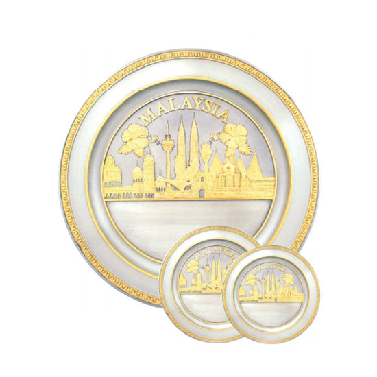 This gold plated tray comes in a round shape. It is designed with Malaysia skyline patterns for an eye-catching look. This well-designed tray is available in two sizes for your selection.