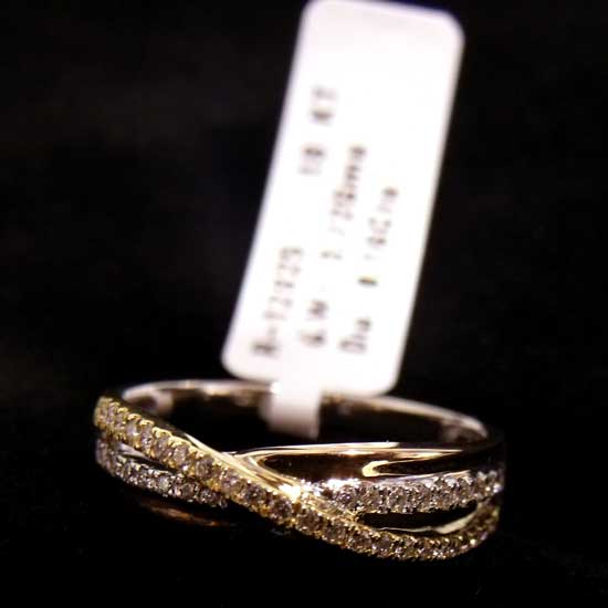 This gorgeous ring features 9K, 14K and 18K gold bands crossing each other, with two of the bands embedded with dazzling diamonds to glisten in maximum brilliance. This fabulous ring is nicely polished to give a shiny finish, accentuating ladies' evening dresses.
