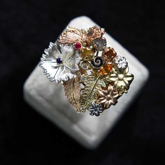 The gold ring in this photograph is designed in the look of a flower bouquet. The gold flowers are fashioned with red sapphire stones to add fanciness. This gold ring is a trendy and fashionable item to wear with casual outfits.