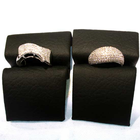 These two gold rings exhibit unique styles. Each ring is crafted with numerous dazzling diamonds on the wide band to reflect eye-catching light. The gold rings add grace and glamor to ladies' ensembles.