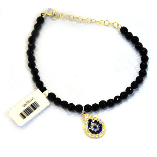 This beaded bracelet is designed with a drop-shaped ornament covered in sparkling stones. It comes with an ethnic pattern that stands out from others. The combination of golden and black gives this accessory a stylized look.