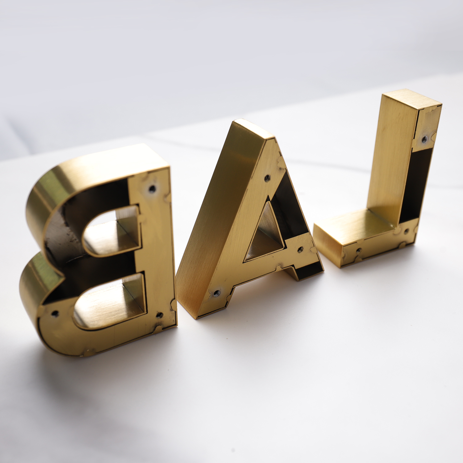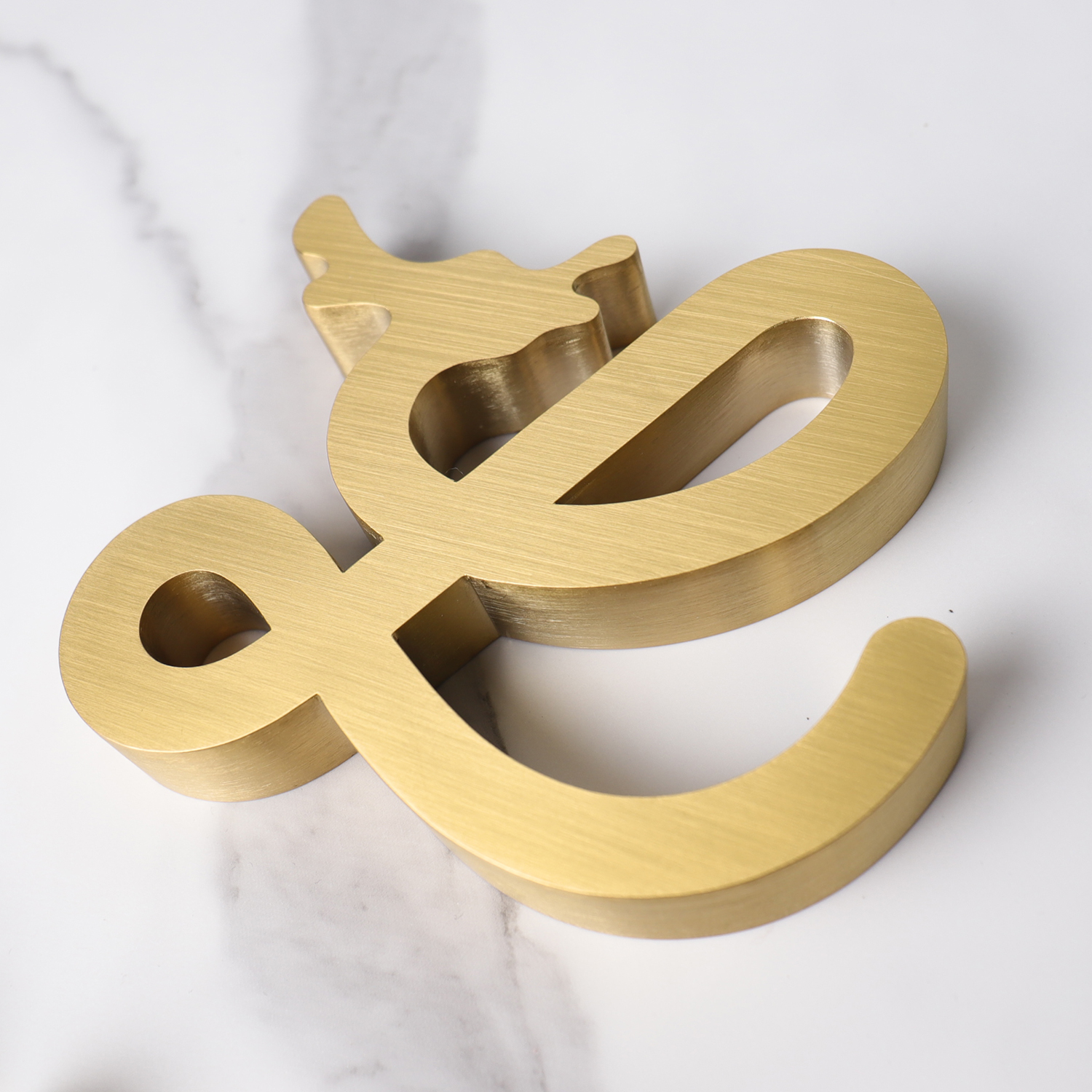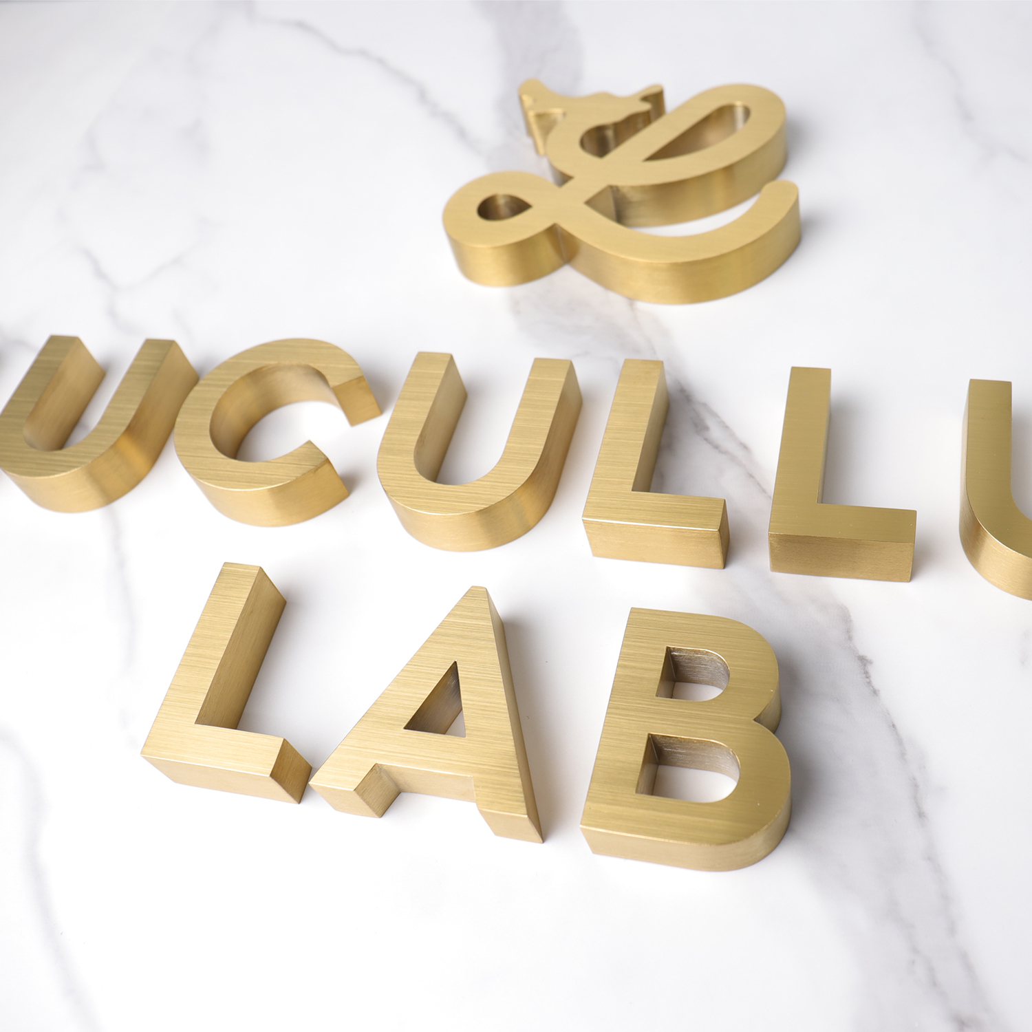 Satin stainless steel signage makes of high-quality stainless steel #304 or #316. Sandblasting or grinding stainless steel, laser cutting, welding, argon arc welding, and polishing create fine metal signage with a strong stereoscopic sense to show a calm, noble, and luxurious visual effect.