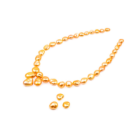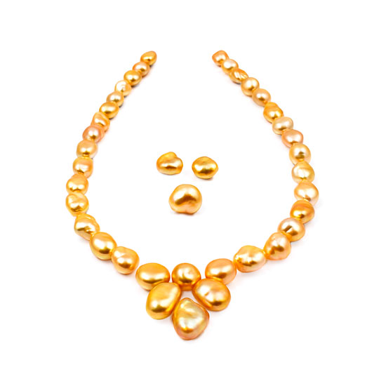 This necklace features golden-colored South Sea baroque pearls. The precious pearls coming in a non-spherical shape are natural-looking. This eye-catching necklace is a great piece of jewelry to adorn your neck and chest.