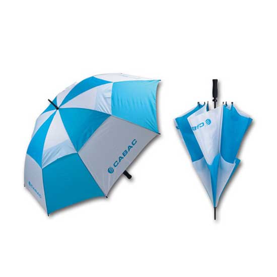 Highlighted here is a golf umbrella in white and blue colors. It is characterized by a double-canopy windproof design. It is equipped with an EVA handle for a secure grip.