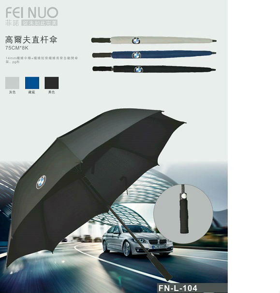 This 8K golf umbrella has a large canopy and is designed to offer reliable sun and rain protection. It flaunts a sturdy construction and has a straight handle with button for automatic opening. The umbrella is adorned with a logo on the canopy and is available in different colors.