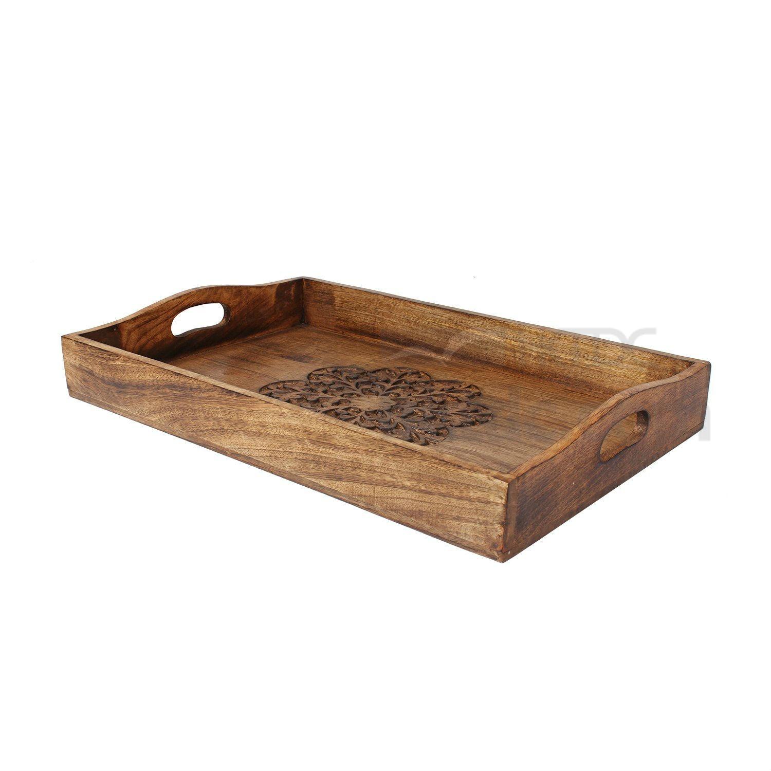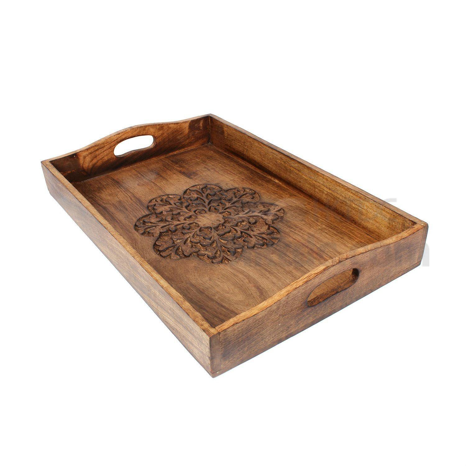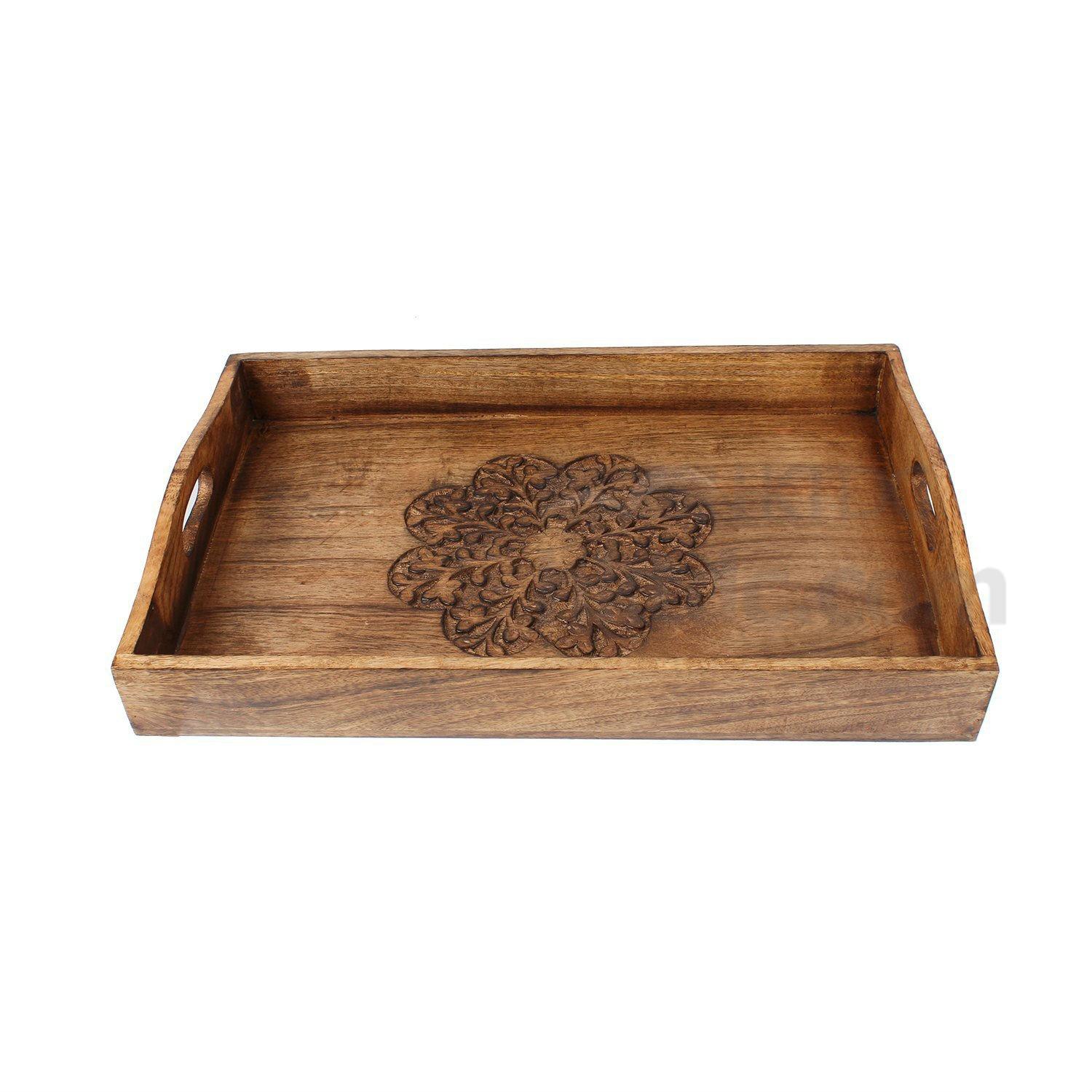 Gorgeous Hand Carved Wooden Decorative Breakfast Serving Tray With Handle Rectangular Floral Carving